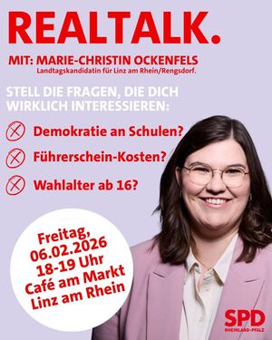 Mit klaren Zielen und einer engagierten Stimme für den Wahlkreis 3 (Linz/Rengsdorf) startet die Linzer SPD ins Wahljahr 2026: Beim traditionellen Neujahrsempfang stellt sich die SPD-Landtagskandidatin Marie-Christin Ockenfels den Bürgerinnen und Bürgern vor. Die junge Sozialdemokratin heißt nicht nur Ockenfels – sie kommt auch aus Ockenfels und ist damit tief in ihrer Heimatregion verwurzelt. Sie wird ihre politischen Schwerpunkte vorstellen und darlegen, welche Themen sie für die Menschen vor Ort in Mainz voranbringen möchte.
